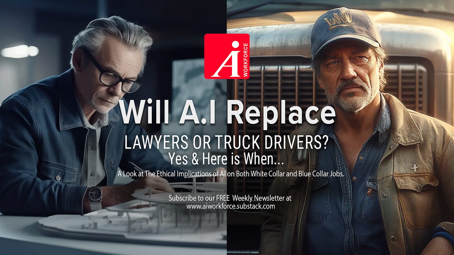 BlogWill Artificial Intelligence Replace Lawyers or Truck Drivers?YES and HERE IS WHEN.....AIworkforceDec 04, 2023∙ PaidShareA look at The Ethical Implications of AI on both White Collar and Blue Collar Jobs. In this part of the Series we will look at if AI will Replace - Lawyers or Truck Drivers?AIworkforce’s Newsletter i…SubscribeThis post is for paid subscribersSubscribeAlready a paid subscriber? Sign in